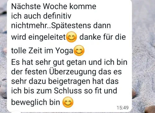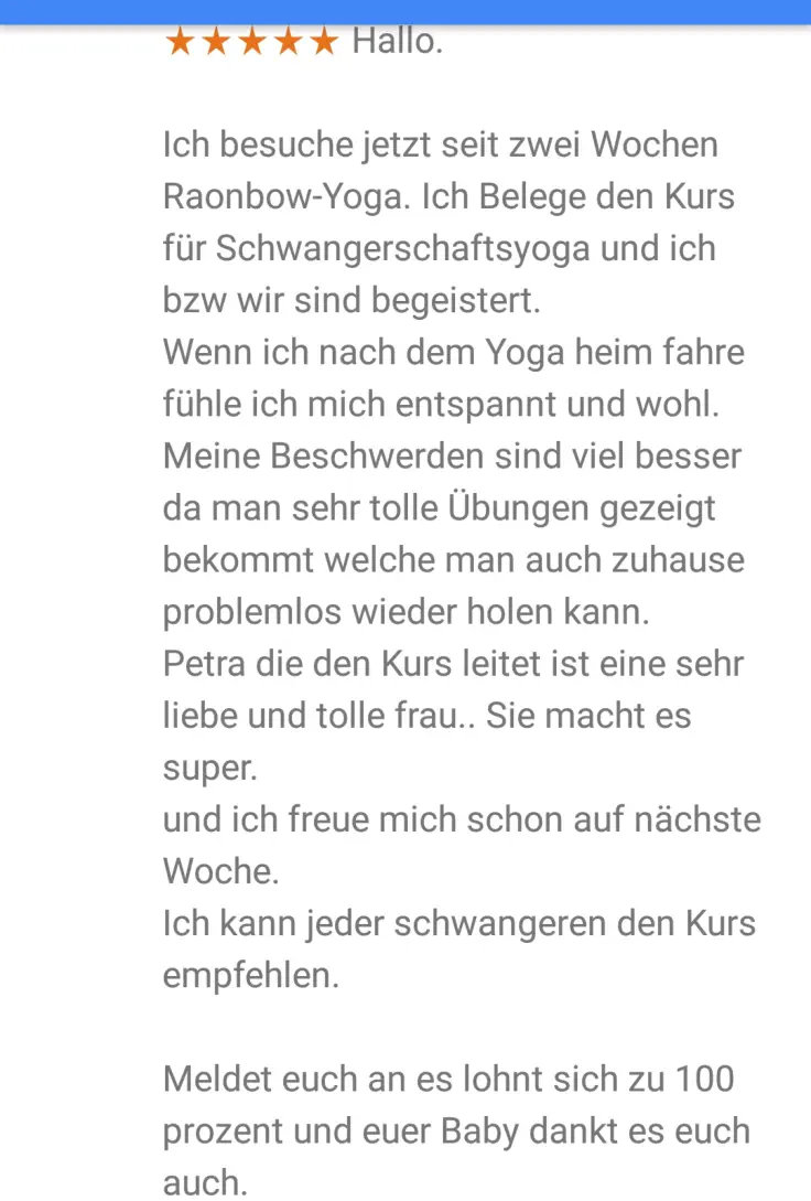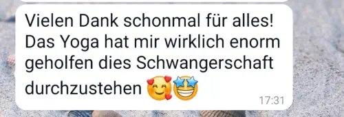 Begleitendes Yoga in der Schwangerschaft Eine Schwangerschaft ist für uns Frauen eine sehr schöne Zeit, aber auch eine Zeit, in der wir Frauen mit großen körperlichen und seelischen Veränderungenzurechtkommen müssen. Schwangerenyoga ist eine schöne und gute Begleitung während dieser Zeitund kann die Vorbereitung auf die Geburt sanft unterstützen.Wir üben sanftes Yoga mit gezielten Lockerungs- und Kräftigungsübungen, die sehr wohltuend für Deinen Rücken sind und Schwangerschaftsbeschwerden vorbeugen. Durch Atemübungen lernst Du Deinen Atem wahrzunehmen und ihn aktiv einzusetzen. Eine abschließende Tiefenentspannungsübung schenkt Dir innere Ruhe und Entspannung. Schwangerenyoga ist von der ersten bis zur letzten Schwangerschaftswoche geeignet. Vorkenntnisse sind nicht erforderlich.Die Yogastunden sind kein Ersatz für einen Geburtsvorbereitungskurs bei der Hebamme.Termin: Mittwoch 16:00 bis 17:30 Uhr – fortlaufendes Kursangebot...Alternativ ist bei ausreichend Anmeldungen auch ein Kurs am Vormittag möglich. Bitte sprich vorher mit Deinem Frauenarzt oder Deiner Frauenärztin, ob gegen eine Teilnahme nichts einzuwenden ist!!!